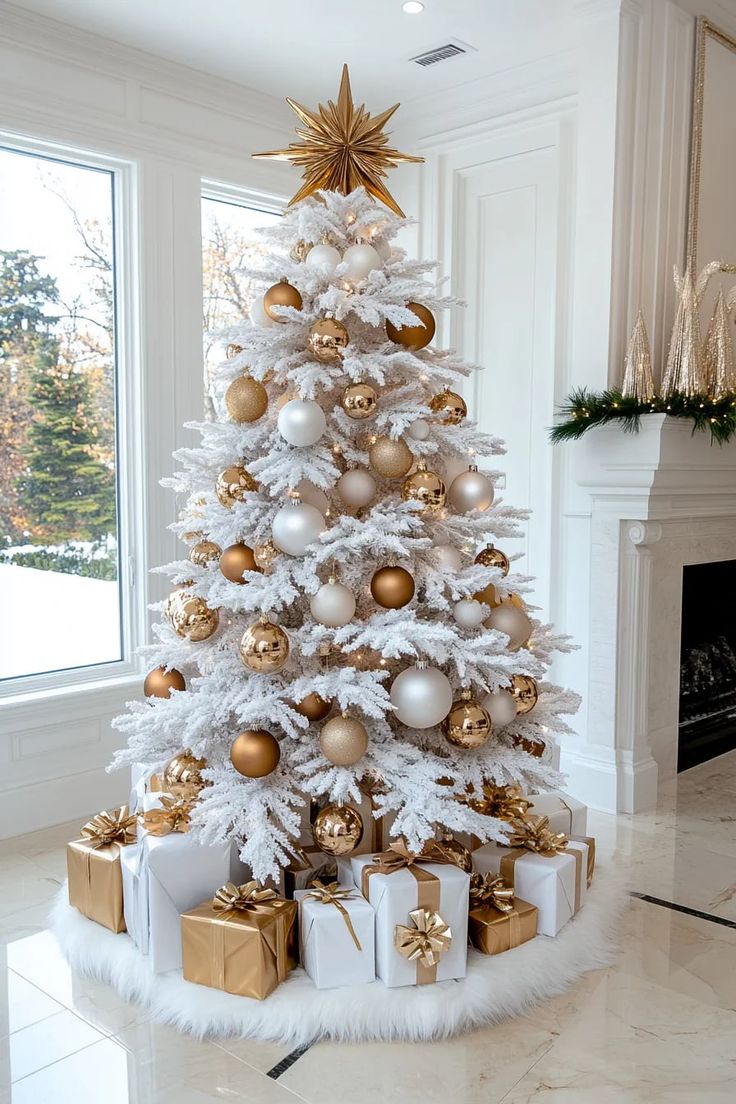 Monokróm arany-fehér karácsonyfa dekorációs inspiráció
